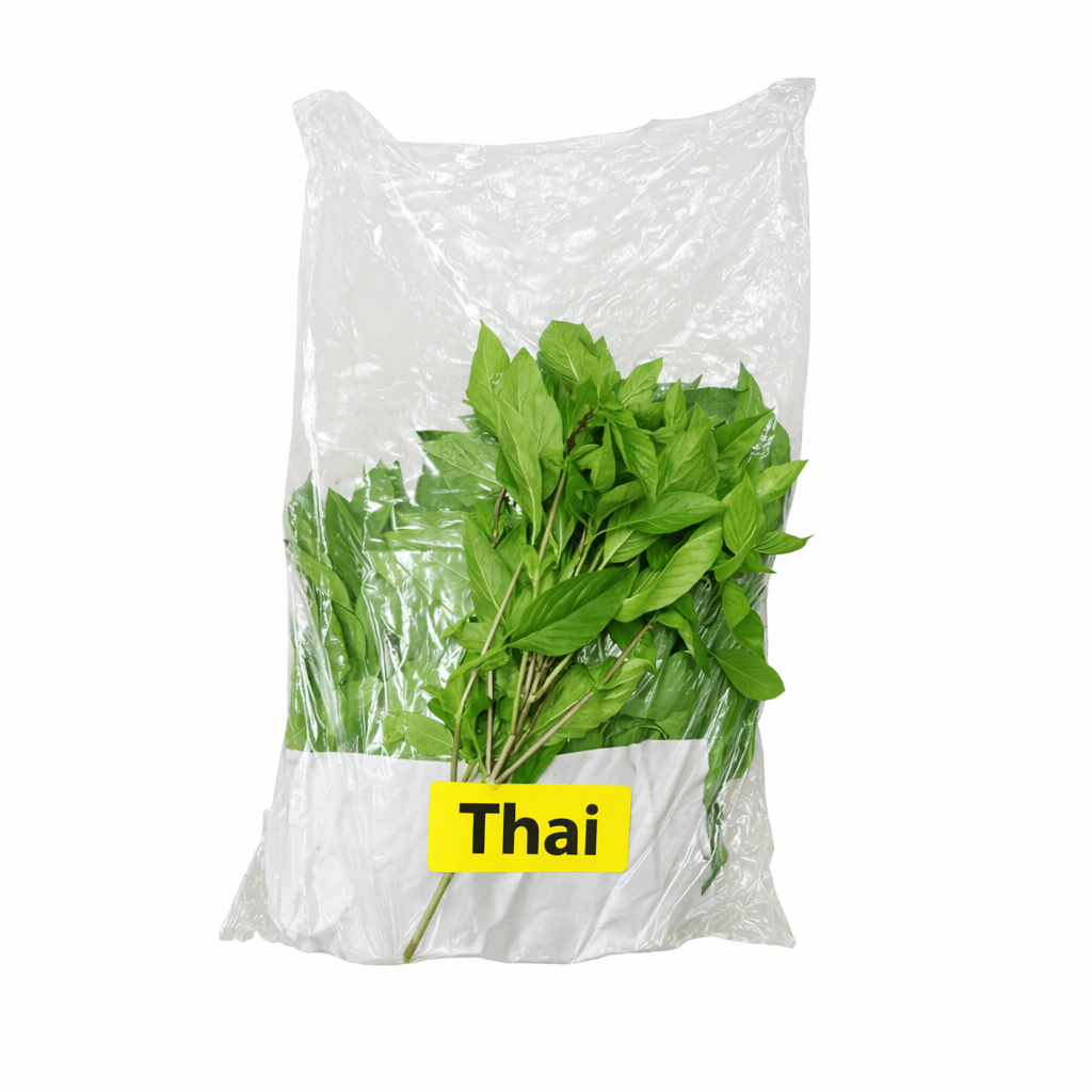 Fresh Thai basil with a distinct aromatic flavor, featuring notes of anise and spice. Commonly used in Southeast Asian cuisine, ideal for stir-fries, curries, soups, and noodle dishes where a bold herbal profile is desired.