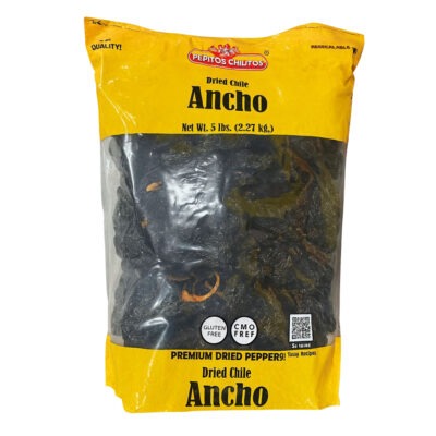 Ancho chile peppers are large, dried versions of the poblano pepper, averaging 10 to 12 centimeters in length and 5 to 7 centimeters in diameter. The peppers have a flat, wide, and heart-like shape with curved shoulders that taper to a round, slightly pointed tip. The surface is deeply wrinkled with many textured folds and creases, displaying dark red, almost black to mahogany hues. Underneath the semi-thick surface, there is a small, open cavity filled with many golden brown, round seeds. Ancho chile peppers have a leathery and chewy consistency with a faint floral, fruity, and smokey aroma. The peppers are considered one of the sweetest dried chiles and have a complex blend of earthy, fruity, smokey, sweet, and subtly spicy flavors with raisin, plum, and paprika nuances.