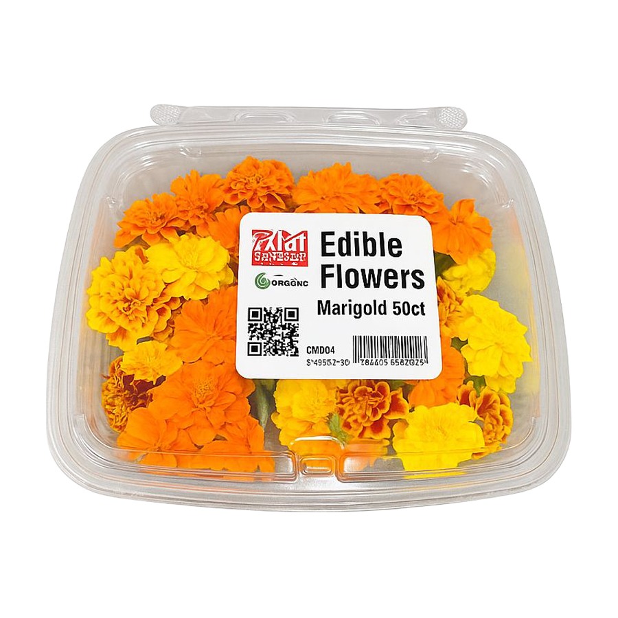 Fresh edible marigold flowers with a mild, slightly citrus and herbal flavor, commonly used in gourmet and decorative cuisine. Ideal for garnishing dishes, salads, desserts, and cocktails, adding vibrant color and visual appeal.